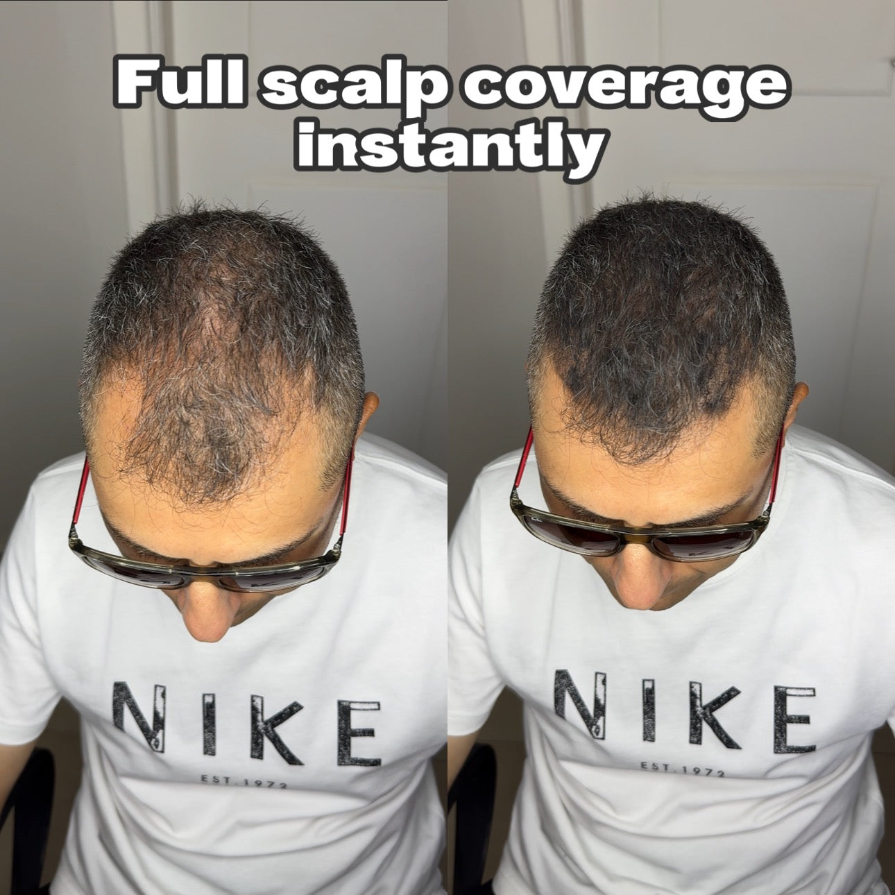 Unlike traditional hair fibers, which can be messy, difficult to manage, and often require special applicators or sprays, Haircair goes on smoothly and effortlessly. Its formula adheres naturally, making it less prone to being wiped or blown away throughout the day. This means you get a neat, natural-looking finish without the hassle or risk of fibers falling off, giving you confidence and convenience in just seconds. And is lightweight so you can take it with you and apply it anywhere.